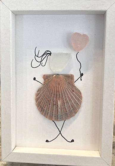 2 1/4 x 3 1/4 framed Sea Glass and shell girl with heart balloon